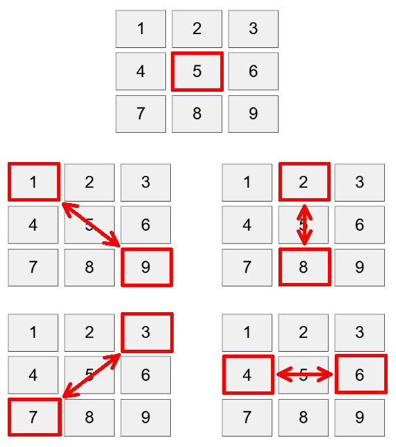 電卓のボタンでは、たして 10 になる数が、5 をはさんだ反対側にあります。
